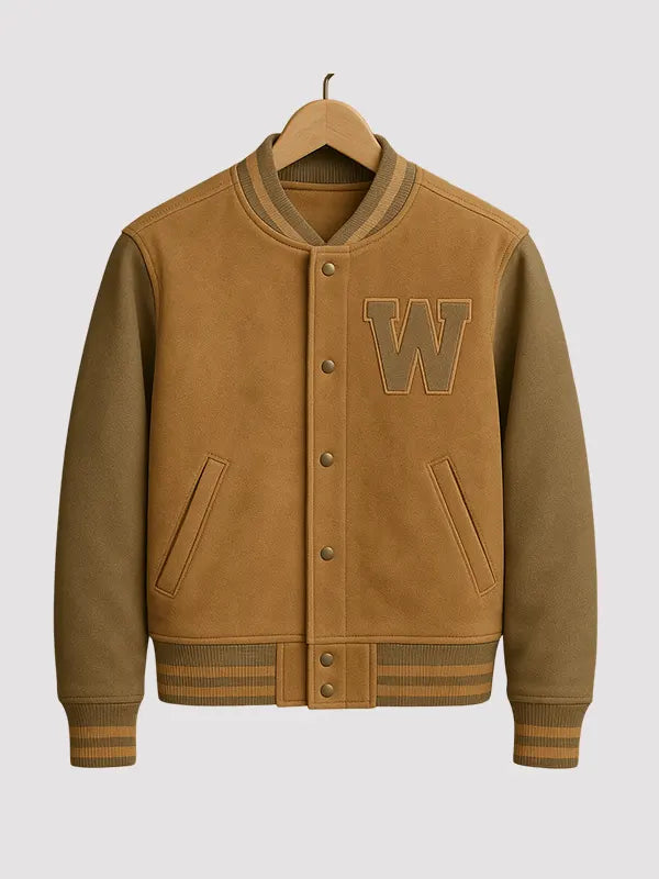 The varsity jacket brown trend is all about versatility, and this suede version takes it a step further by offering a luxurious texture that stands out while remaining understated. Combining heritage inspiration with a modern fit, the brown varsity jacket blends nostalgia with contemporary fashion for a look that’s effortlessly cool. Choose this standout suede jacket to embrace confidence, durability, and lasting style.